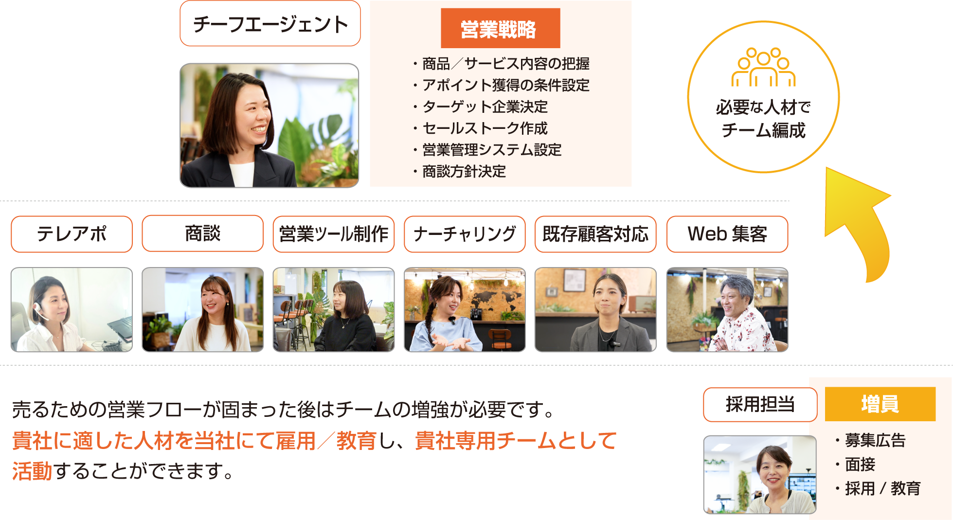 営業部門を成功に導くチーフエージェントを筆頭に、しっかりと訓練された営業人材が揃っており、貴社に必要な人材でチーム編成ができます。