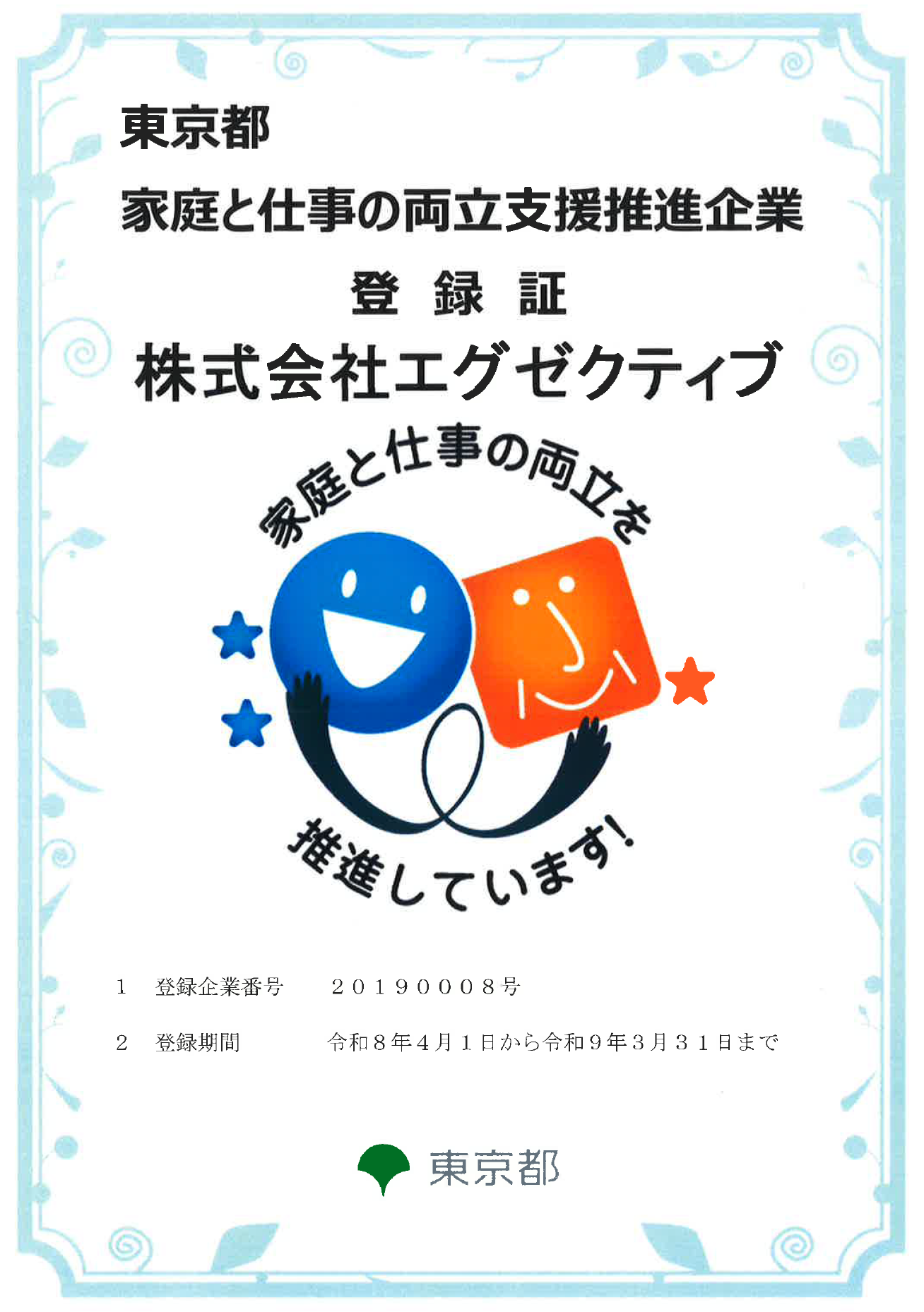 株式会社エグゼクティブは、東京都の認定制度「家庭と仕事の両立支援推進企業」において、「育児と仕事の両立」「介護と仕事の両立」の両分野で継続して認定されたことをお知らせいたします。